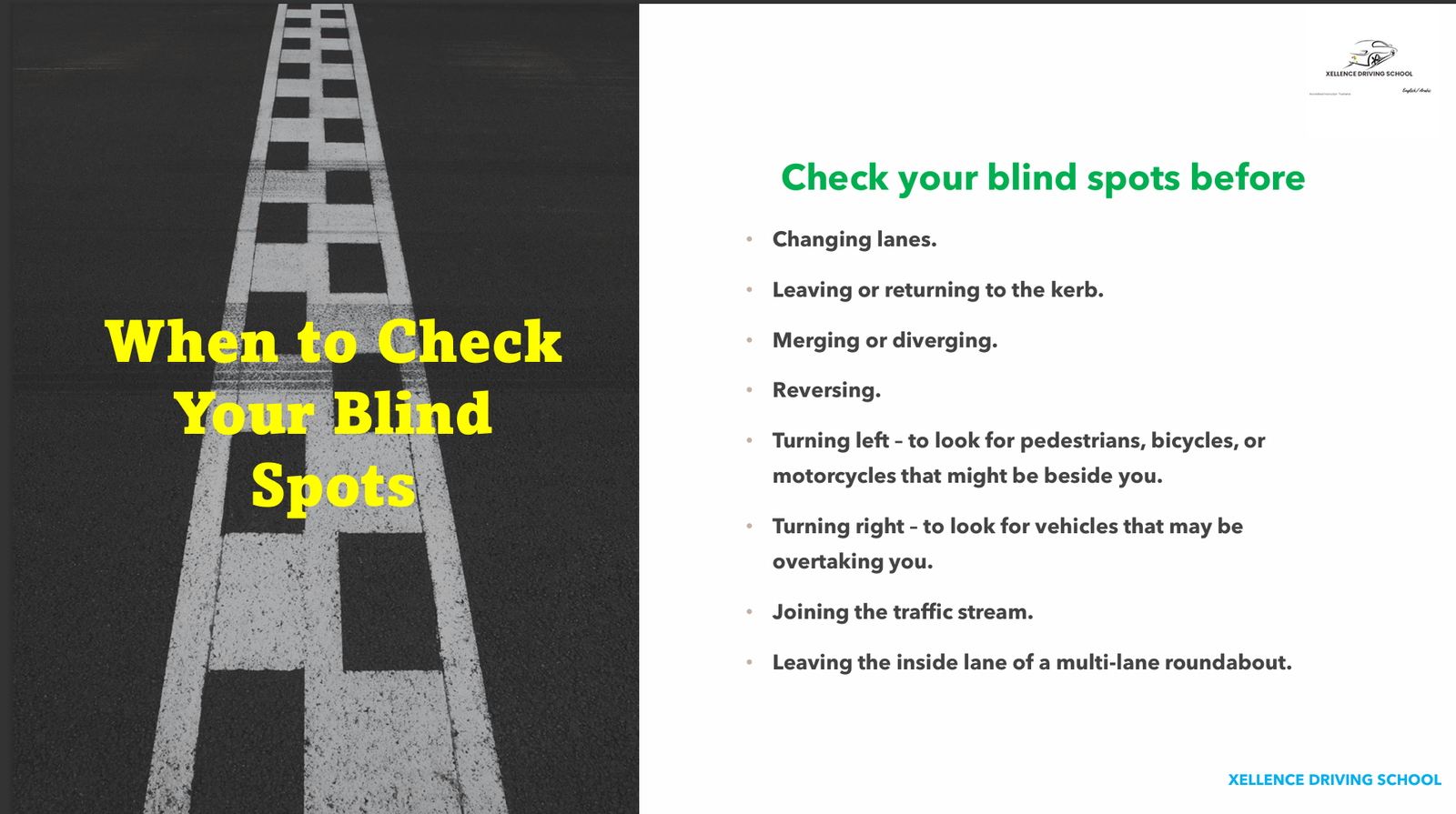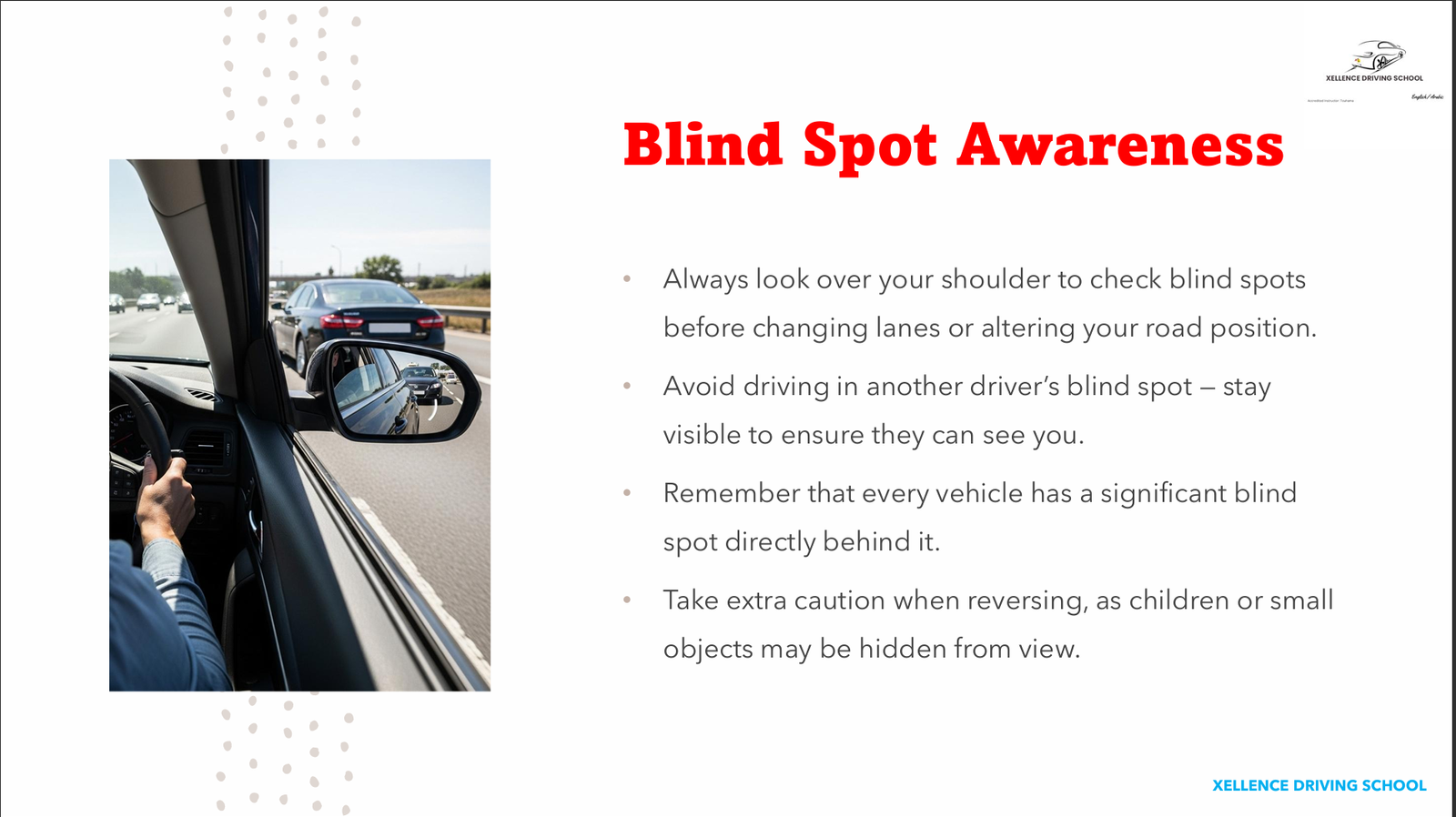 This is why checking blind spots is a critical safety step, not a minor extra. It’s one of the first habits we drill into students at Xellence Driving School.